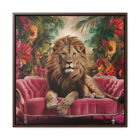 Lion King Square Canvas Wall Art, Majestic Regal Lion with Beautiful Mane on Pink Velvet Couch, Tropical Flowers, Framed Gallery Prints,