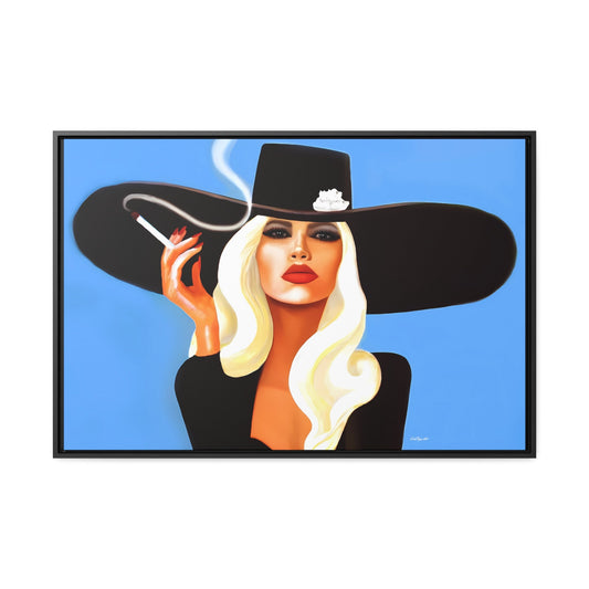 glamorous blonde woman smoking a cigarette in a big black hat framed canvas wall art, wall art living room framed, woman decor, portrait