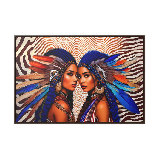 beautiful native american women in feather headdress framed canvas wall art, framed wall art for living room, american indian, southwestern
