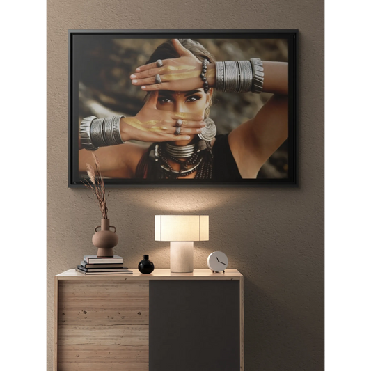Indigenous Woman Silver Jewelry Square Canvas Wall Art, Ethnic Decor, Exotic Fine Art Photography, Mysterious Home Decor, Dramatic Wall