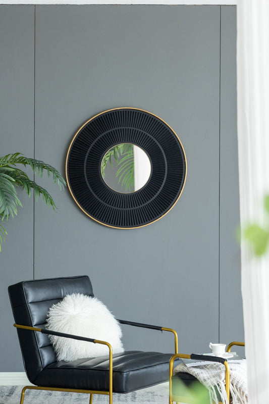 31.5x1x31.5" Round Carter Wooden Mirror with Gold Iron Frame Neutral Colorway Wall Decor for Live space, Bathroom, Entryway Wall Decor
