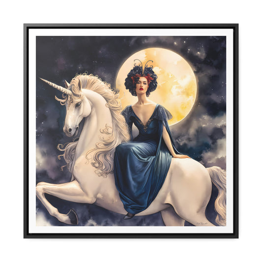 Square Framed Canvas Wall Art, Art Nouveau Style Red-Haired Woman Riding Unicorn Under Full Moon, Fantasy Decor, Magical Night, Gallery