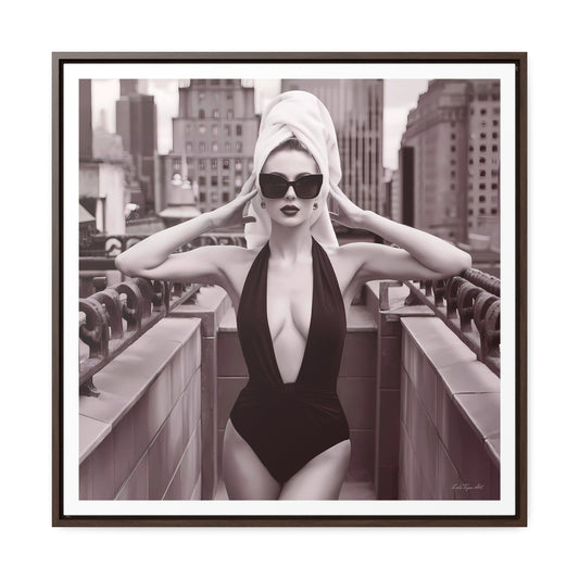 Fashion Model Sepia Art Canvas Wall Wrap, NYC Rooftop Glam Decor, Sexy Swimsuit Square Frame Art, Fashionista Wall Decor, City Chic Home