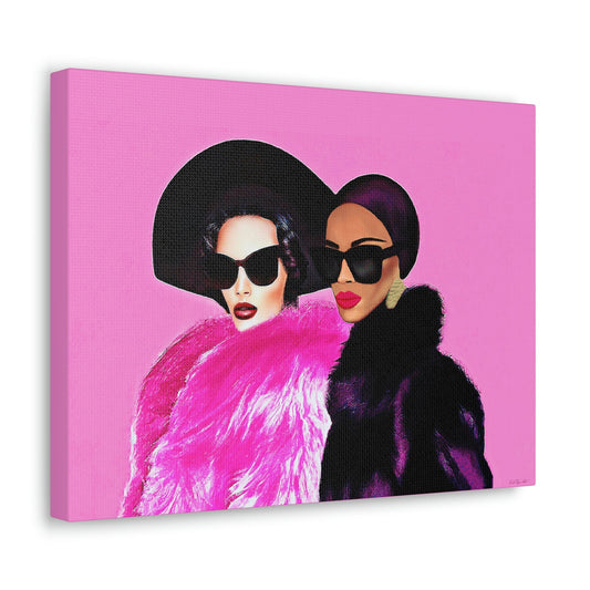 two women latina and black in fur coats and hats framed canvas wall art, wall art living room framed, pink wall art, glamourous wall art
